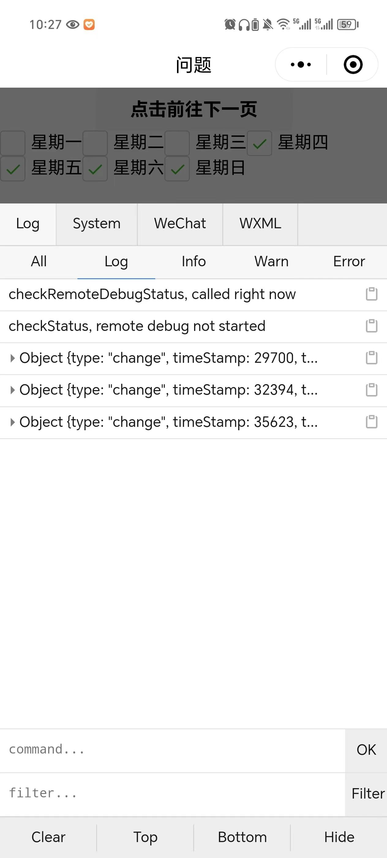 <checkbox-group value="{{weekTimeVal}}" bindchange="selectDateChange" class="check_group_box"><checkbox class="checkbox hours_checkbox" value="1" checked="true">星期一</checkbox><checkbox class="checkbox hours_checkbox" value="2" checked="true">星期二</checkbox><checkbox class="checkbox hours_checkbox" value="3" checked="true">星期三</checkbox><checkbox class="checkbox hours_checkbox" value="4" checked="true">星期四</checkbox><checkbox class="checkbox hours_checkbox" value="5" checked="true">星期五</checkbox><checkbox class="checkbox hours_checkbox" value="6" checked="true">星期六</checkbox><checkbox class="checkbox hours_checkbox" value="7" checked="true">星期日</checkbox></checkbox-group>weekTimeVal: ['1', '2', '3', '4', '5', '6', '7'],selectDateChange(e) {console.log(e)}以上代码在微信开发者工具中正常,在真机调试时,拿到的数据是双份checkbox是不是绑定了重复的值,所以才返回呢,建议排查一下