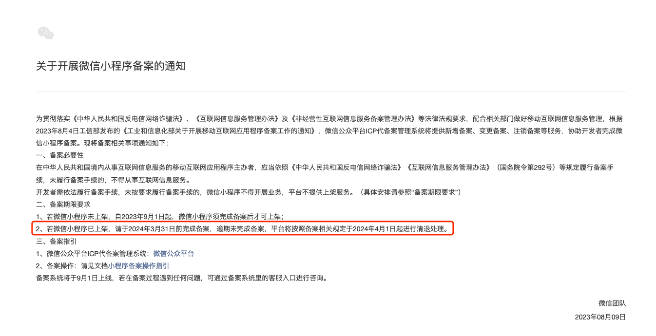 忽然发现官方没有了这个关于存量小程序备案的强制通知啊(之前官方公告明确说存量小程序必须在3月底完成备案,否则在次日进行清退处理。)