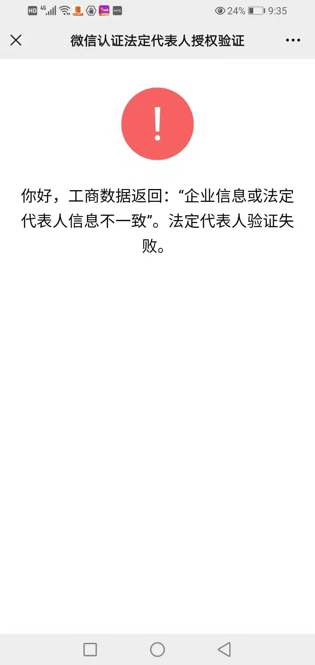 工商执照信息没问题,法人微信绑定的也是本人银行卡,法人微信实名认证也是本人,执照2016年注册的,提交微信认证法人扫码认证时就提示信息不一致,麻烦官方技术帮忙解决一下,实在是着急不知道怎么弄了!