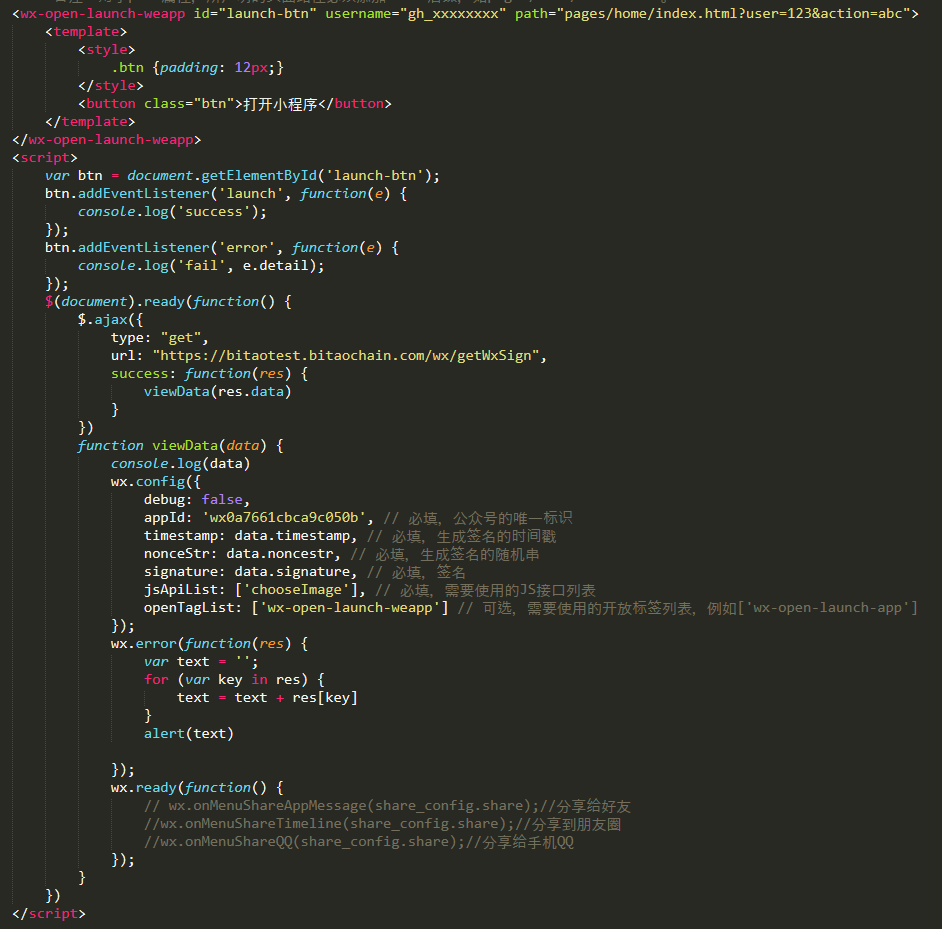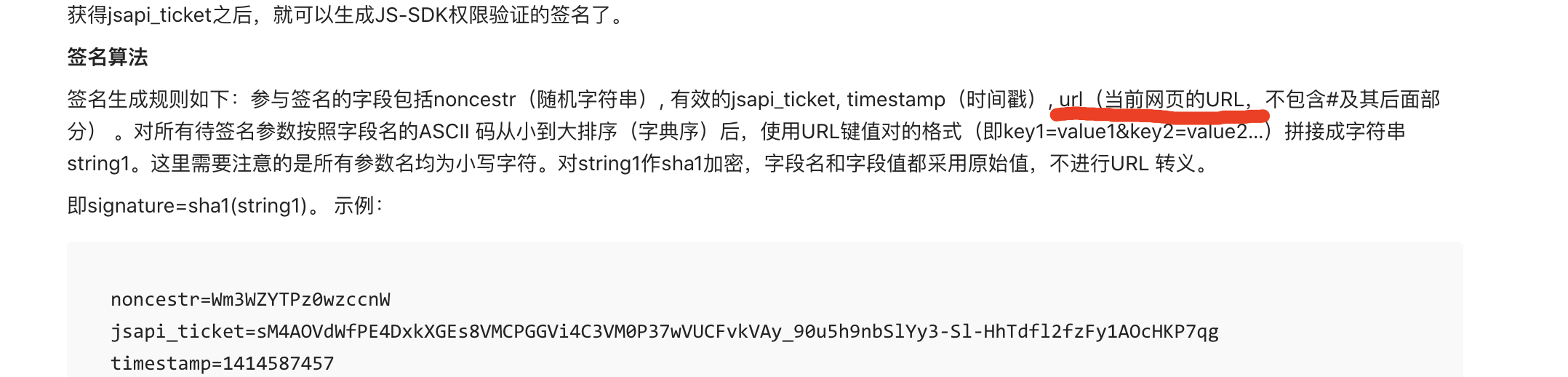 确保你获取用来签名的url是动态获取的,动态页面可参见实例代码中php的实现方式。如果是html的静态页面在前端通过ajax将url传到后台签名,前端需要用js获取当前页面除去'#'hash部分的链接(可用location.href.split('#')[0]获取,而且需要encodeURIComponent),因为页面一旦分享,微信客户端会在你的链接末尾加入其它参数,如果不是动态获取当前链接,将导致分享后的页面签名失败。