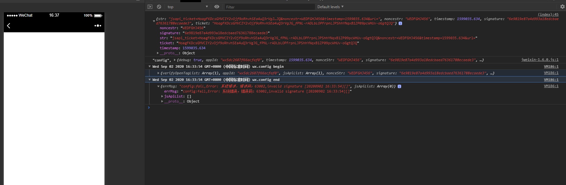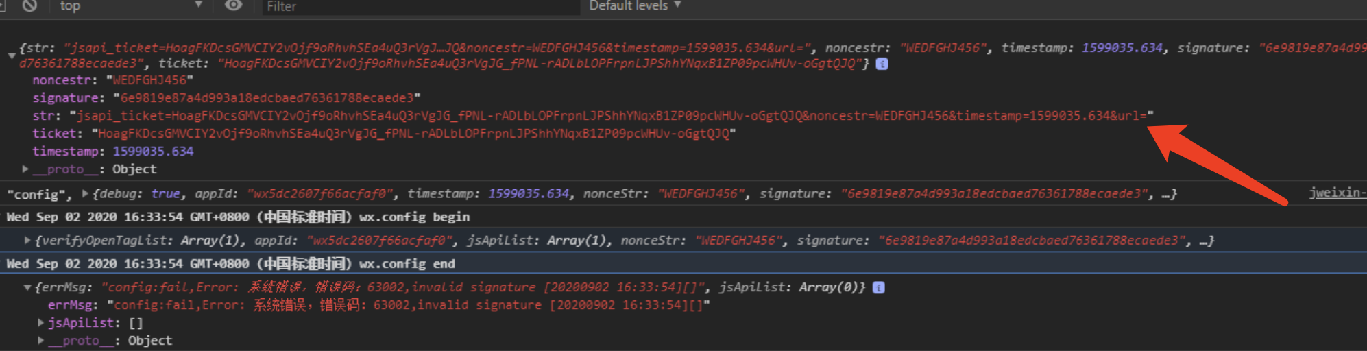 确认config中nonceStr(js中驼峰标准大写S), timestamp与用以签名中的对应noncestr, timestamp一致。