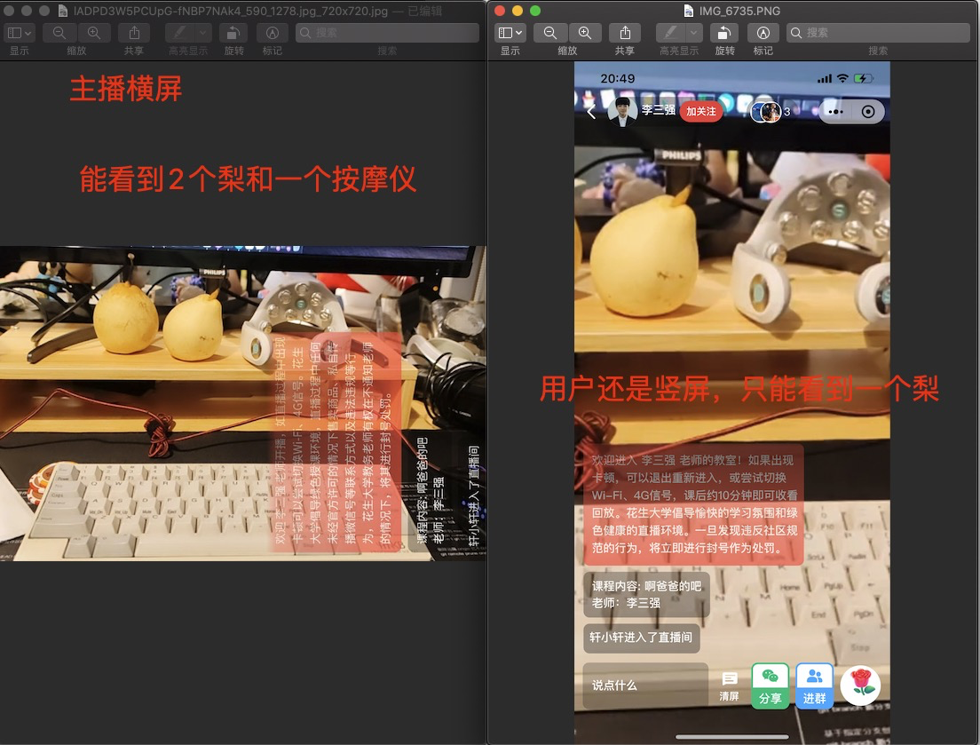 主播端录制的画面是2个梨和一个按摩仪,而用户端看到的只有一个梨。