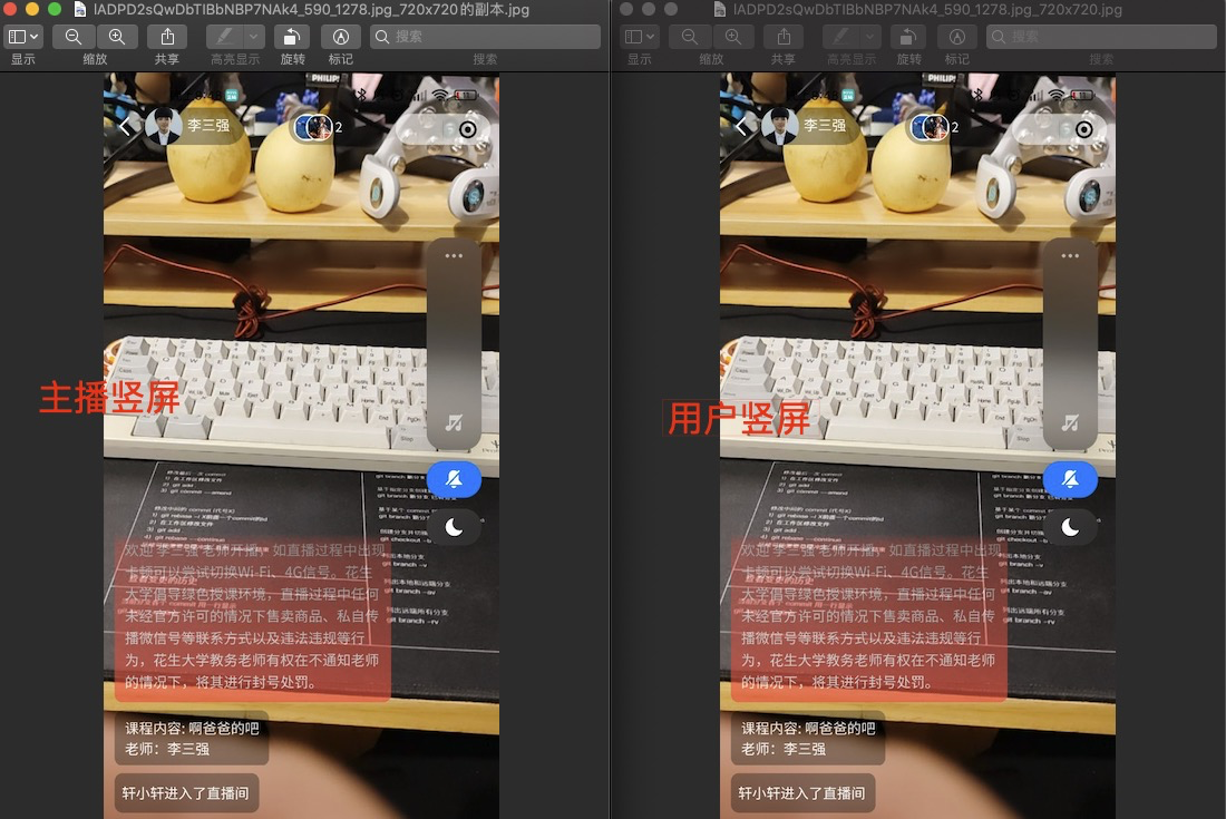 1、主播竖屏录制,用户竖屏观看。双方都没问题,录制内容和观看内容是一模一样的。如下图。