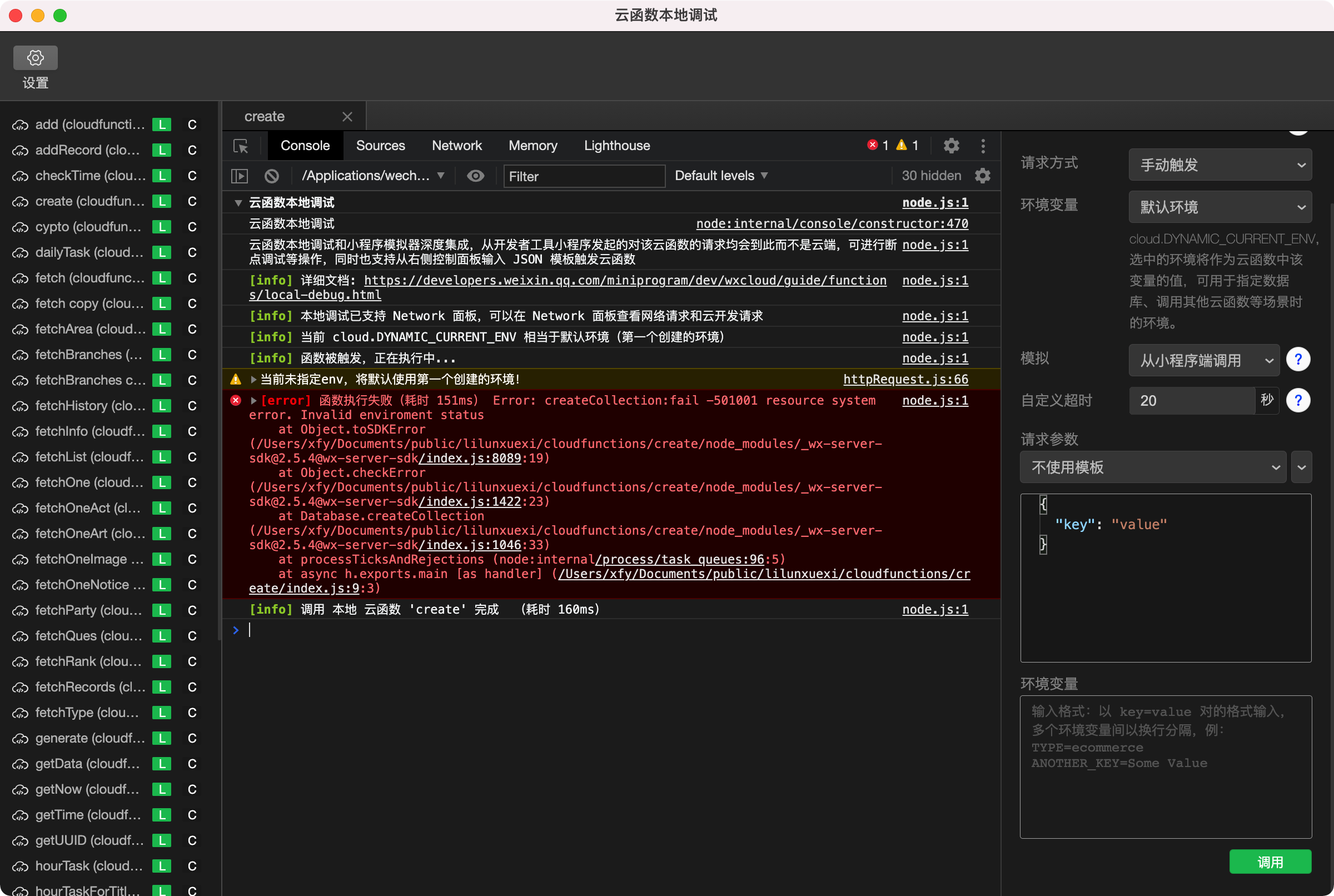node.js:1 [error] 函数执行失败(耗时 151ms) Error: createCollection:fail -501001 resource system error. Invalid enviroment status