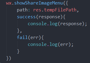 wx.showShareImageMenu({path: res.tempFilePath,success(response){console.log(response);},fail(err){console.log(err);}})wx.downloadFile({url: 'https://res.wx.qq.com/wxdoc/dist/assets/img/demo.ef5c5bef.jpg',success: (res) => {wx.showShareImageMenu({path: res.tempFilePath})}})