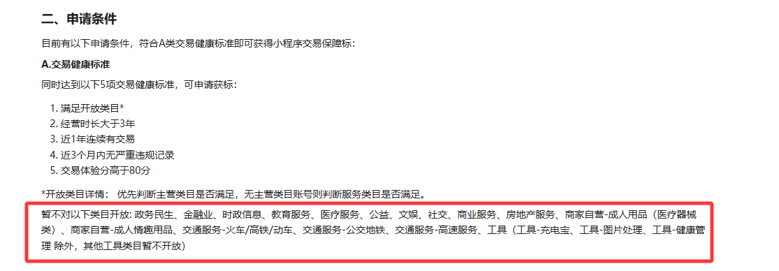 官方文档只写了小程序交易保障标暂不开放的类目,我们的小程序不属于这些类目,但也没看到保障标的申请入口,有谁知道哪些主营类目可以申请交易保障标?