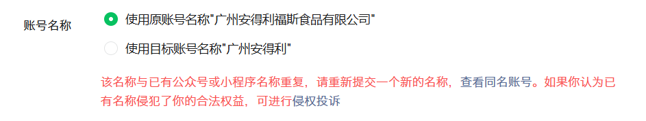 现有服务号需要迁移成订阅号,在勾选原有名称的时候显示有重复无法勾选,可是目前是没有重名的小程序和账号的,除了这个已注销的号,是不是腾讯后台误判了?也找不到客服,麻烦帮忙解答,谢谢!
