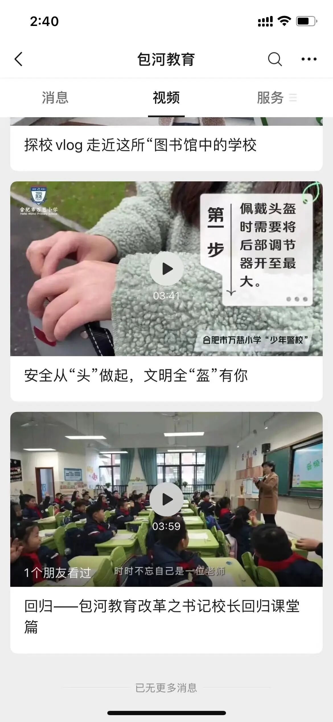 你好,需要发送类型是视频消息类型才会展示在视频中的,你看看你发表的类型是不是都是视频消息类型,如果是图文消息会展示在消息中而不是视频中