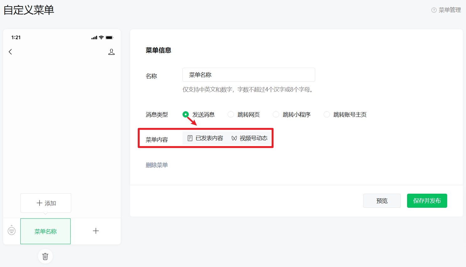 自定义菜单发送消息中纯文字消息还支持吗?菜单内容中已经找不到文字入口。只有已发表内容和视频号动态两个选项