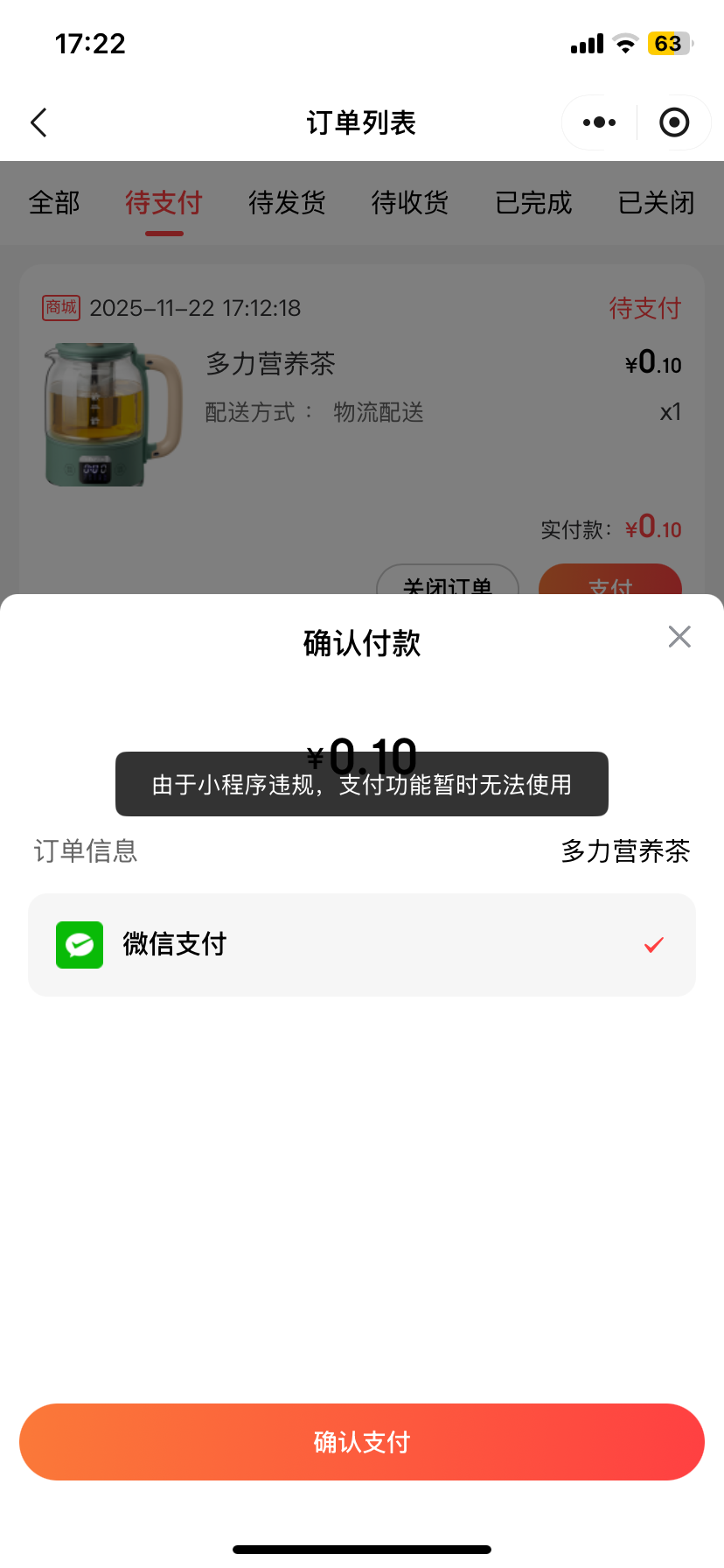 小程序已认证备案好,生成支付的时候会提示"由于小程序违规,支付功能暂时无法使用",请问是怎么回事。