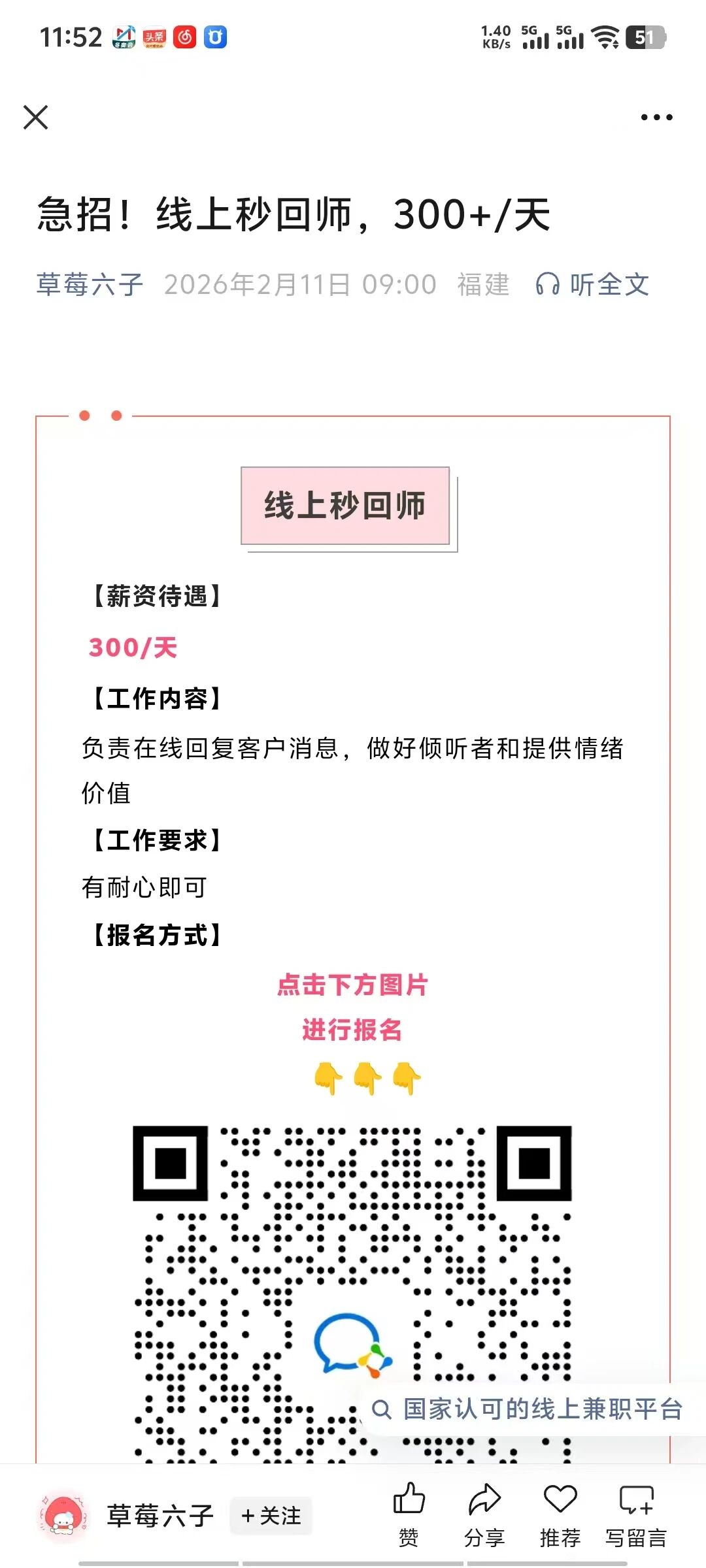 参考的违规相关条例:《微信公众平台关于整治网络诈骗信息的公告》平台明确禁止发布各类网络诈骗信息,包括但不限于虚假兼职、刷单返利等。对于以 “高薪兼职”“轻松赚钱” 为噱头的虚假信息,将依据违规严重程度采取删除内容、限制功能、封禁账号等处罚。