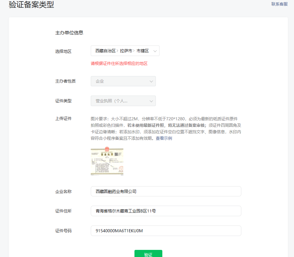 公司注册地址是在青海省藏青工业园区,但是藏青工业园区是属于西藏管辖,所以公司主体备案是在西藏。在备案小程序时提示以下信息,之前公司反馈小程序出现这个问题已解决,麻烦技术人员帮忙反馈再处理下,感谢感谢~~