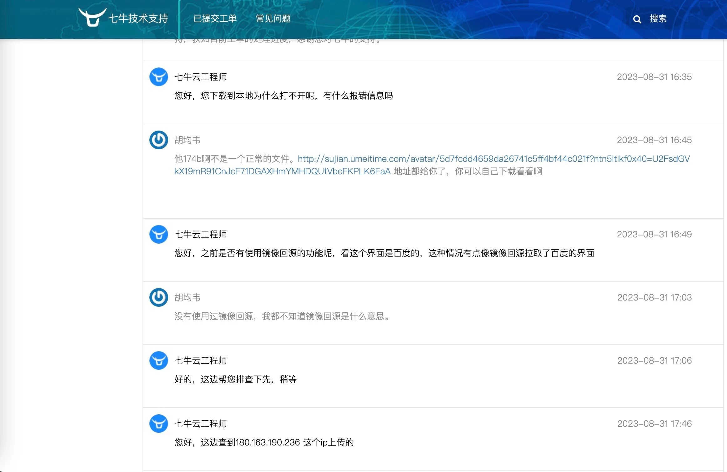 你们官方封了我的网站,总要给我一个具体的理由吧,如果不是人为投诉,你们怎么检测这个地址违规的,我通过七牛云那边提交的工单,他们技术支持都无法给出一个合理的解释,这个地址打开直接跳转到百度里面了, 这本来是一个上传头像的功能存储到七牛里面的文件,谁把这个html源码写到我的七牛云存储里面去了,并且谁又投诉了我的网站?这个事情非常蹊跷啊。