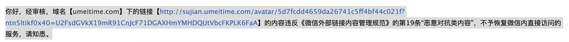 我的域名www.umeitime.com被微信拦截,多次申请都没反馈结果,无意间从网站找到了一个邮箱地址:moment@tencent.com,抱着试试看的态度发了一封邮件,阐述了我的域名没有任何违规,为啥会被屏蔽,收到的回复是: