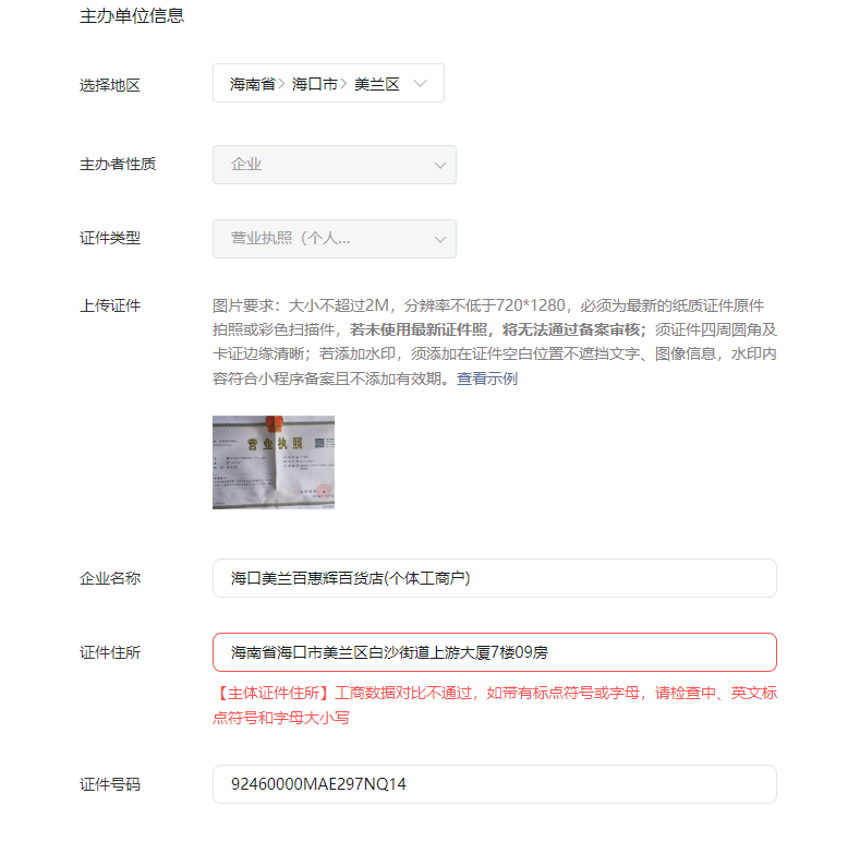 小程序备案提示工商数据对比不通过,如带有标点符号或字母,请检查中、英文标点符号和字母大小写