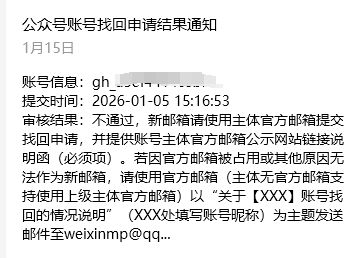 我要找回公众号,可是按照要求提交了材料却出现这个回复,什么意思呀?求帮助。