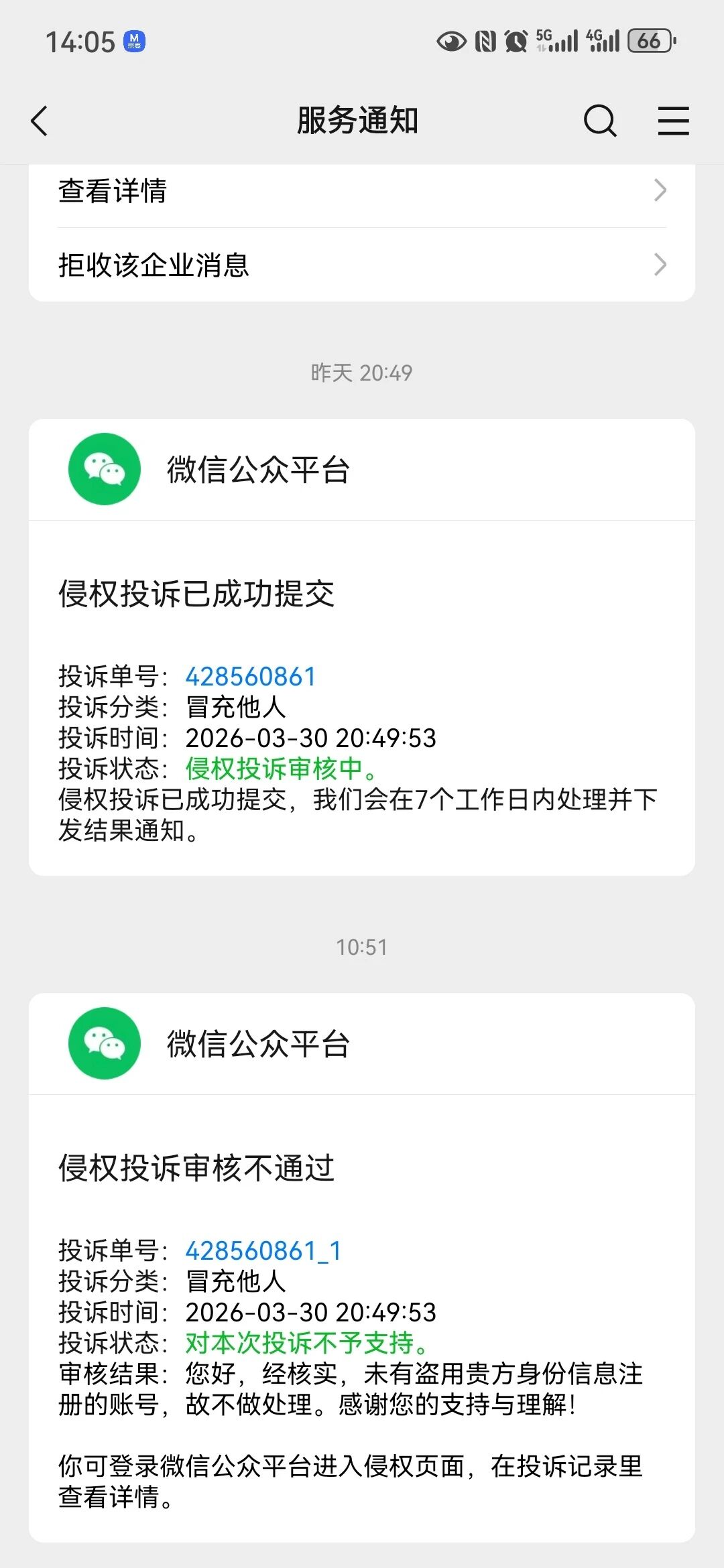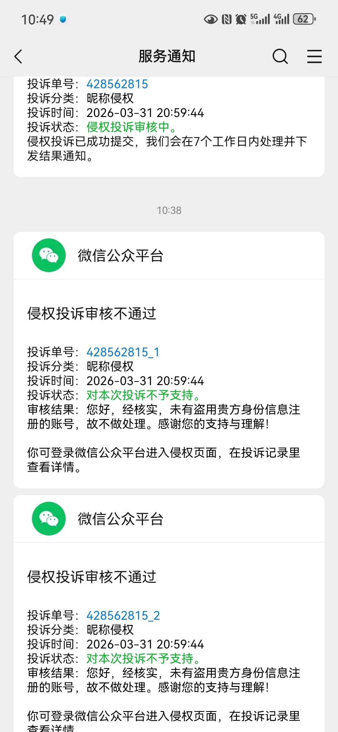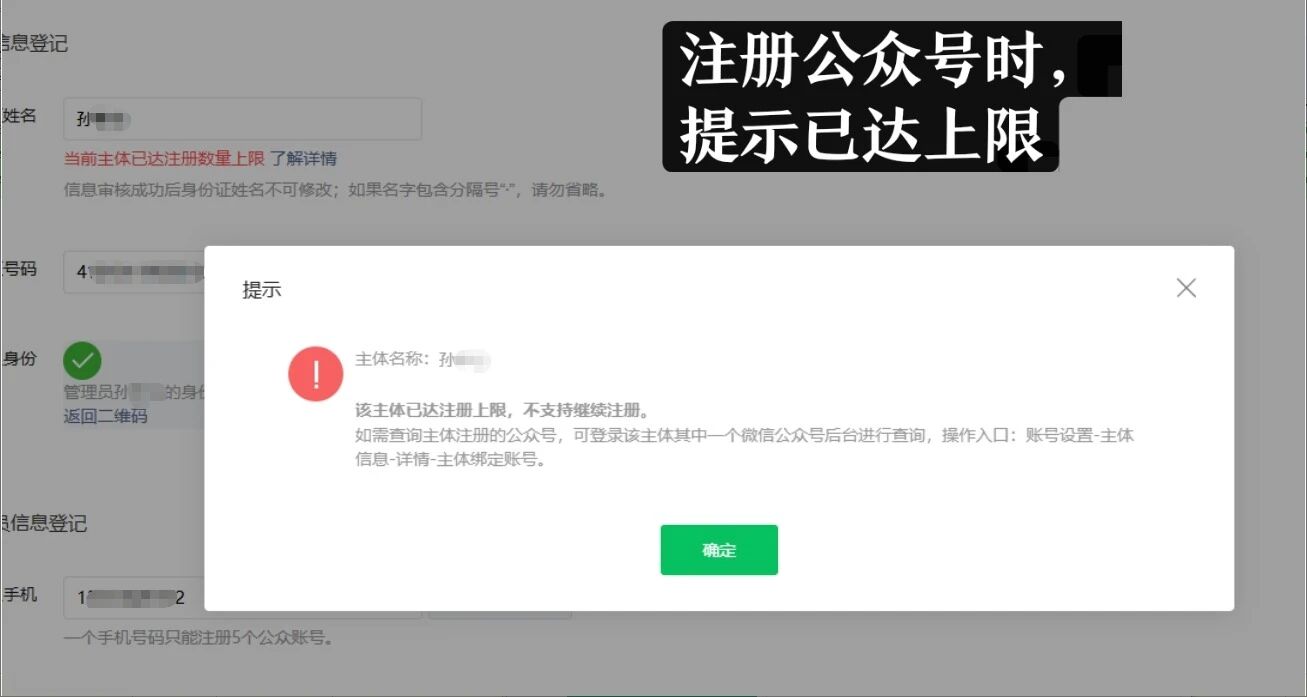 如题,注册公众号时提示身份信息被占用 已达上限,公众平台上查询两个被封禁的账号,我通过各种渠道投诉,都提示身份信息未被占用,一边是申请公众号时提示已达上限,一边是未被注册,你们这是开玩笑的吗?