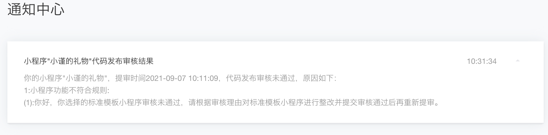 你选择的标准模板小程序审核未通过,请根据审核理由对标准模板小程序进行整改并提交审核通过后再重新提审。