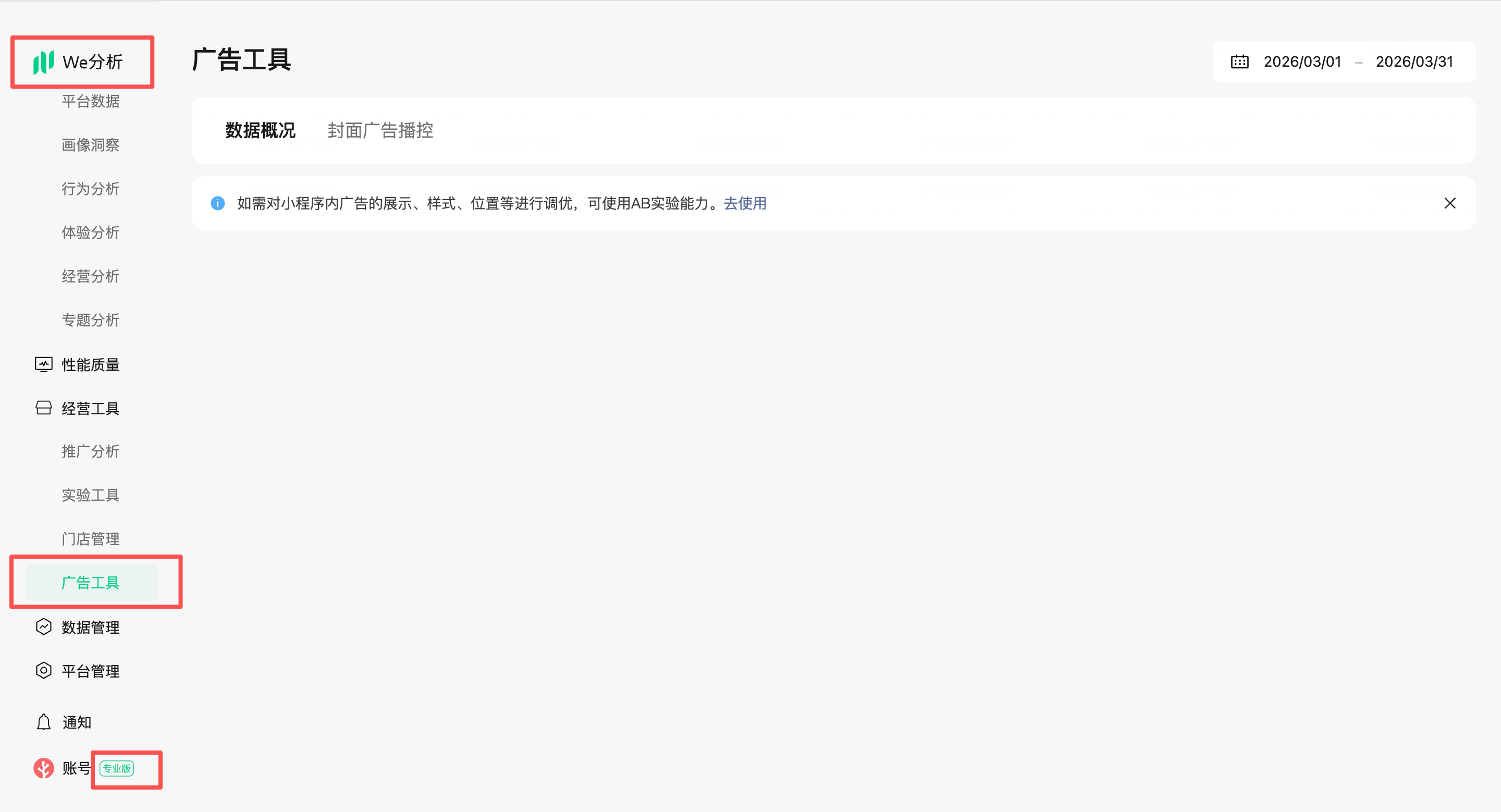 1、A账号登录小程序,进入数据We分析,开通了专业版,看不到广告工具里面的内容;
