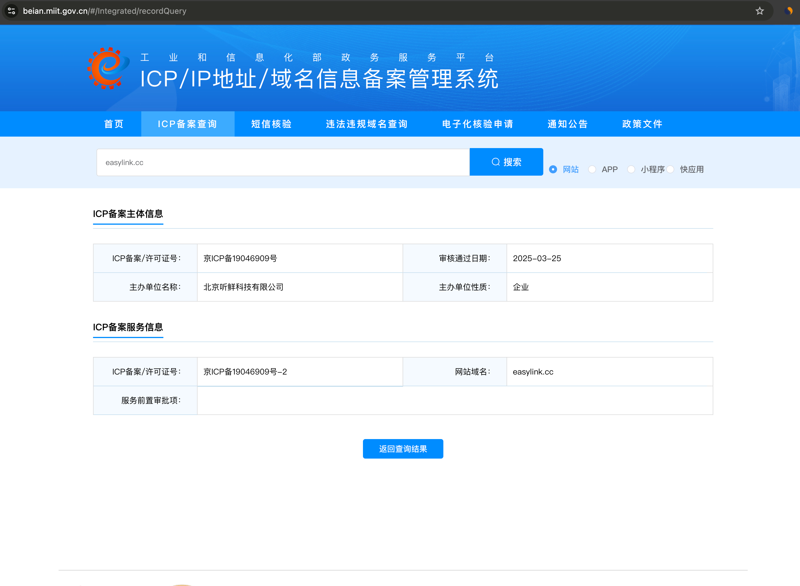 各位管理员和版主好,我的域名 easylink.cc 目前被腾讯封禁,在微信中无法访问,显示"已停止访问该网页",提示"网页存在安全风险,为维护绿色上网环境,已停止访问"。