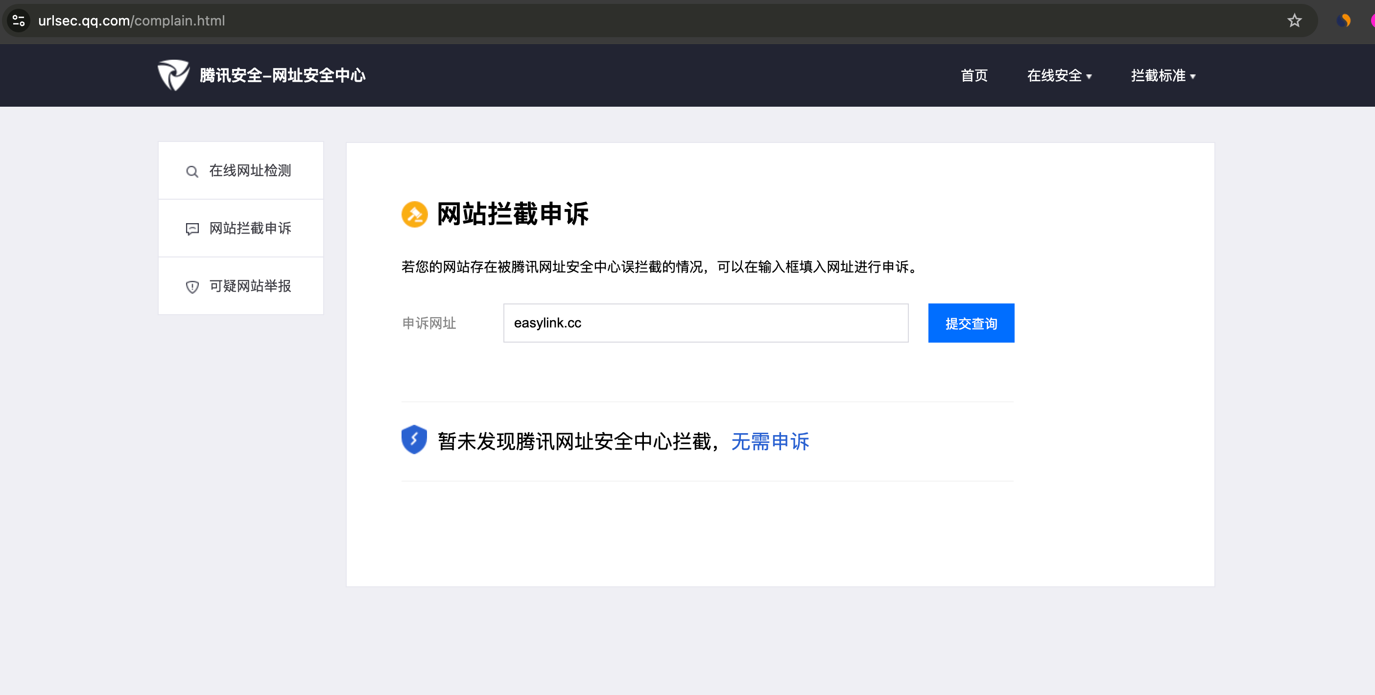 但是当我在腾讯网址安全中心(urlsec.qq.com/complain.html)查询时,系统显示"暂未发现腾讯网址安全中心拦截"。