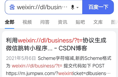 想在短信里直接打开小程序的,先用接口测试得到结果,发给自己和同事,发现短信里并没有触发任何调起事件,就想着在浏览器里打开也行,就直接复制到浏览器网址上了,也没有打开小程序,变成了搜索,但是同事的苹果手机浏览器就打开了小程序, 我的是vivo,又测试小米手机,也无法通过浏览器网址直接跳转到小程序,