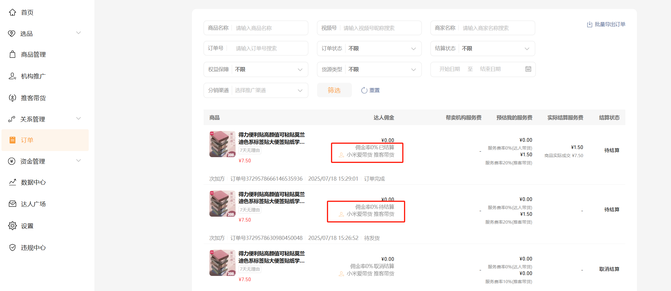 联盟带货机构服务费是为10%,达人是可以的,我这边推客是走机构分佣,首先设置了推客佣金比例为10%,推客设置某商品比例是为10%,如下所示: ,获取该商品比例分佣也是10%,如下所示:通过 推客带货 /推客推广商品获取 /获取某个推客某个商品的推广二维码的方式购买了商品,无论是我【推客】购买,还是分享给其他用户,佣金都是0,这是怎么回事? 是因为染色,还是哪里没设置好?