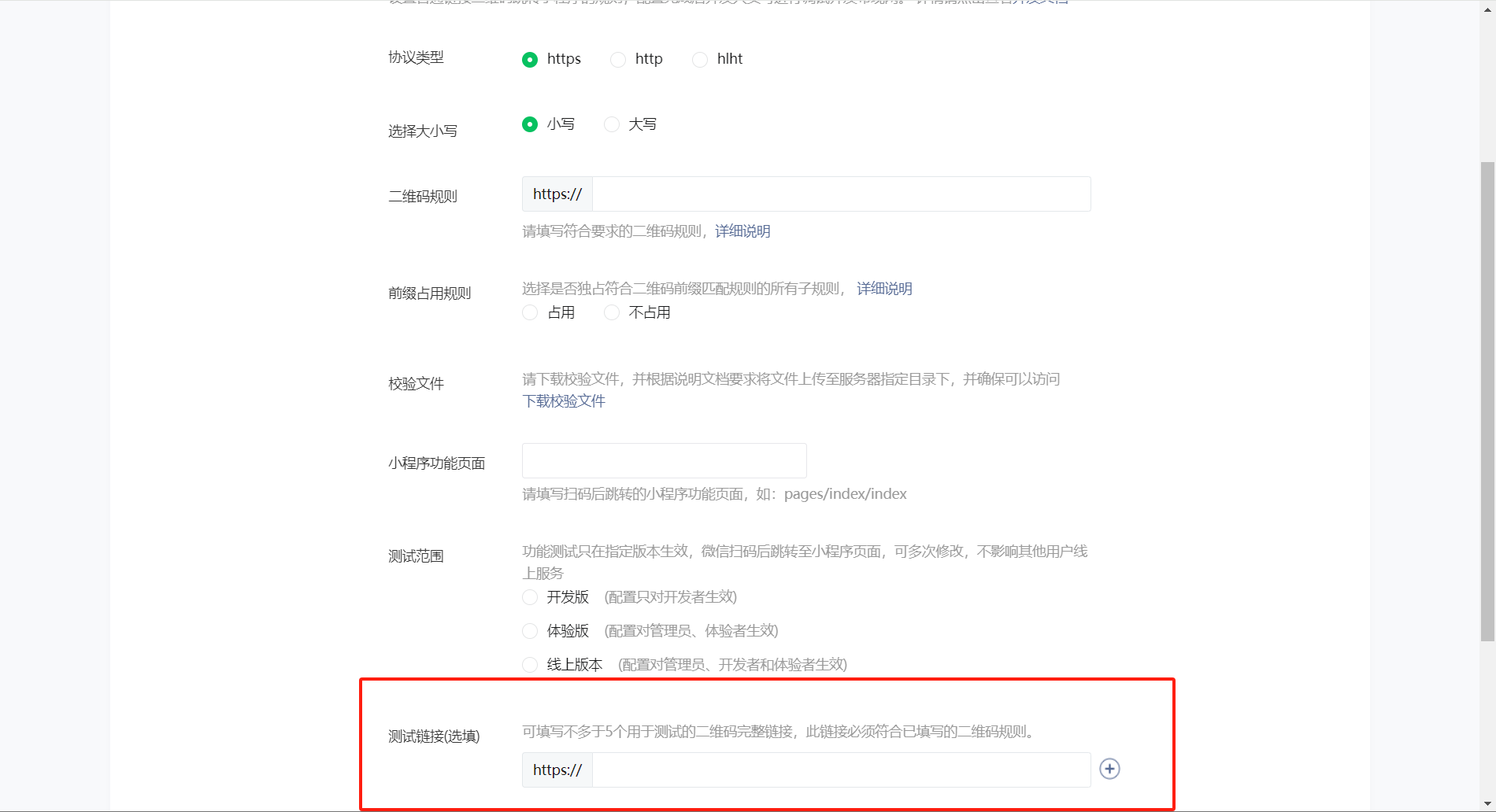 就是我现在测试指定页面带参数生成二维码,我这里有测试链接,我现在开发版用的这个测试链接,我现在就是添加了5个后,我都能扫码打开,我要是上线发布后,用户能否用这5个打开呢?我这个5个加满了,我还想添加我是新建另外一个添加还是什么?