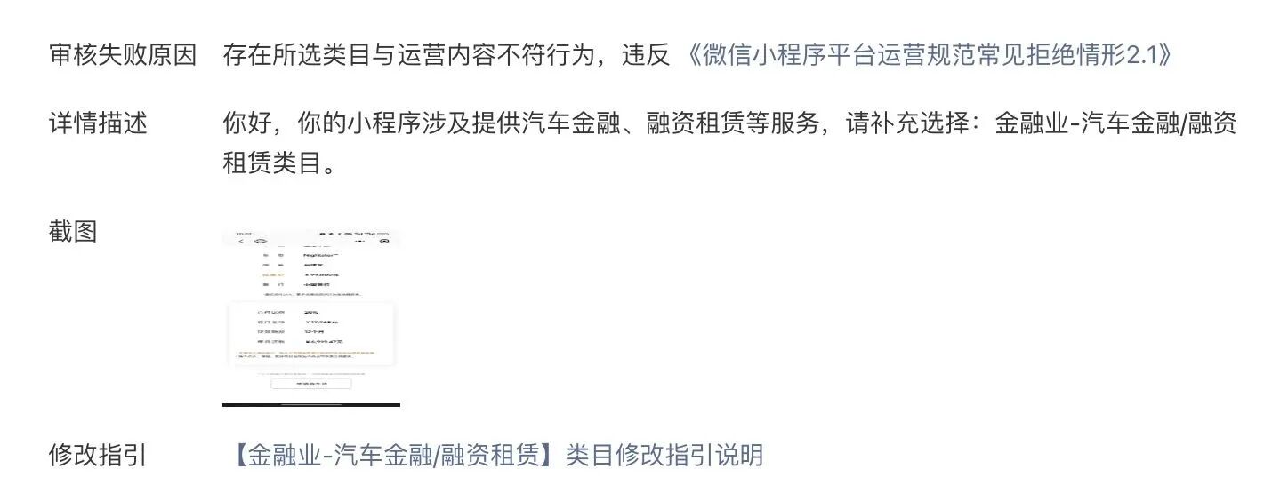 你好,小程序内提供汽车金融相关服务内容,建议补充选择【金融业-汽车金融/融资租赁】类目,具体审核以提审版本内容为准。