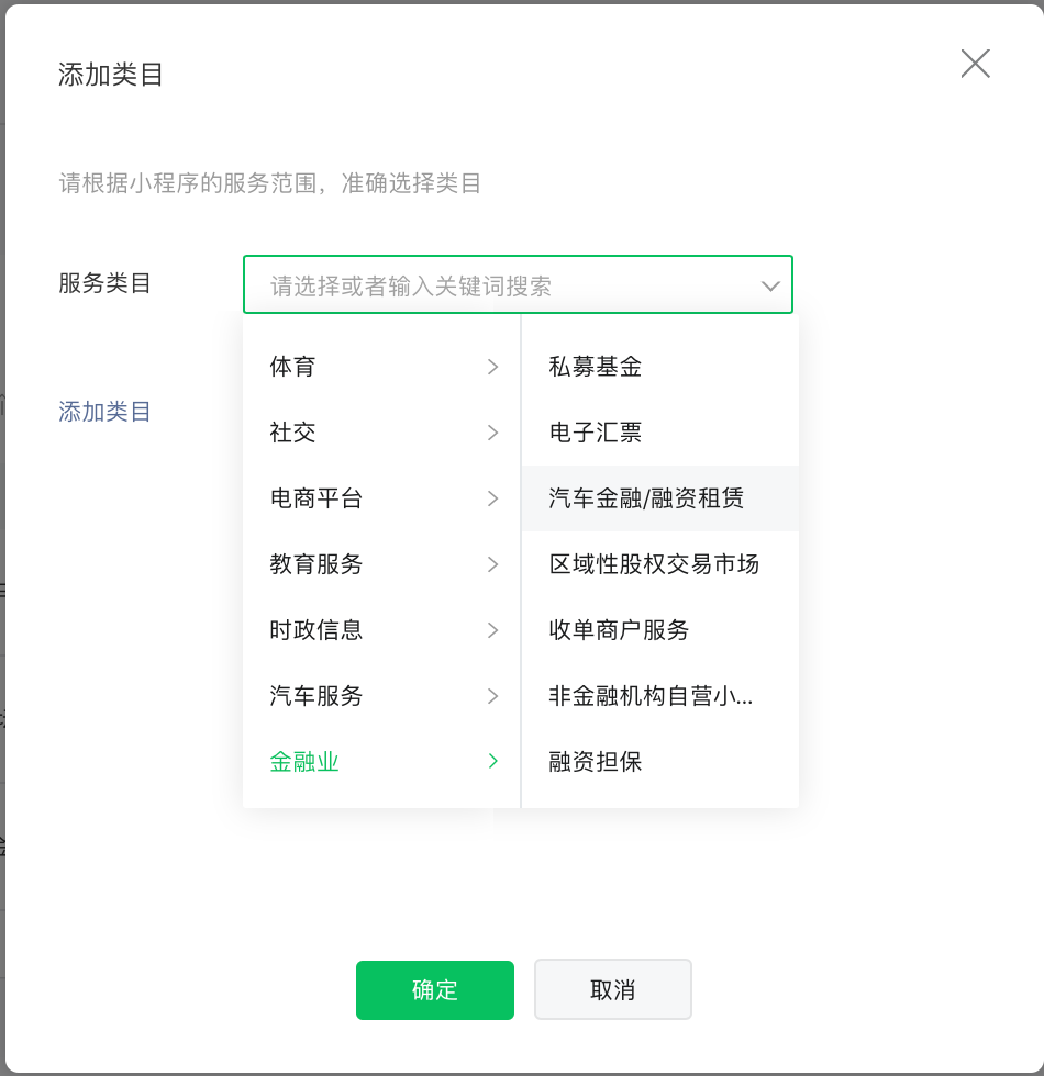 小程序如果需要展示类似汽车分期付款等金融类页面,按照要求需要补充“金融”类资质。但有一个情况,如果所有的金融服务都由第三方提供,而非小程序主体提供的,那么应该申请补充哪个类目?