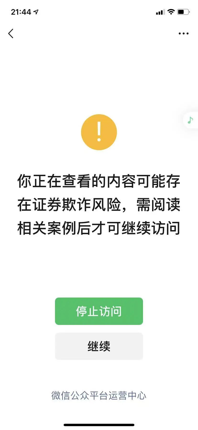 我的个人公众号显示:你正在查看的内容可能存在证券欺诈风险,需阅读相关案例后才可继续访问,该如何申诉?我事实上没有这种行为。