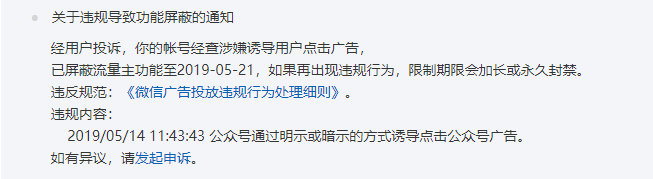 看到相关帖子才想起来,去年五月份推送的一条文字超链接被判定诱导用户点击广告,其超链接内容为h5游戏,标题内容并未有诱导用户点击广告的行为。当时觉得是误判就没用心申诉,被驳回了才追悔莫及。时隔9个月,突然想起此事,个人认为其内容及标题并未有诱导行为,所以希望重新申诉一遍, 现在还有机会重新申诉的渠道吗?这种违规的是怎样触发的,希望可以吸取教训。求解,求申诉。原始ID为:gh_25e43c6c251b