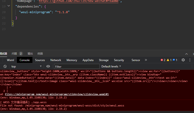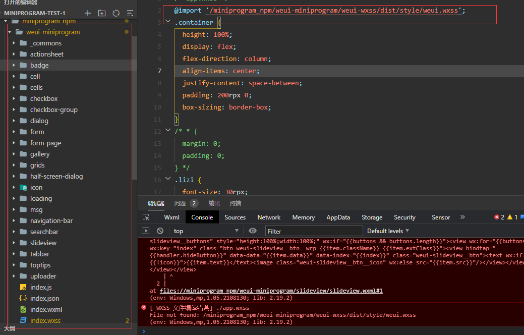 weui现在默认的npm安装的是1.1.0,构建npm之后出现miniprogram_npm这个文件夹,但是这个文件夹下面并没有weui-wxss文件夹,所以wxss也找不到,