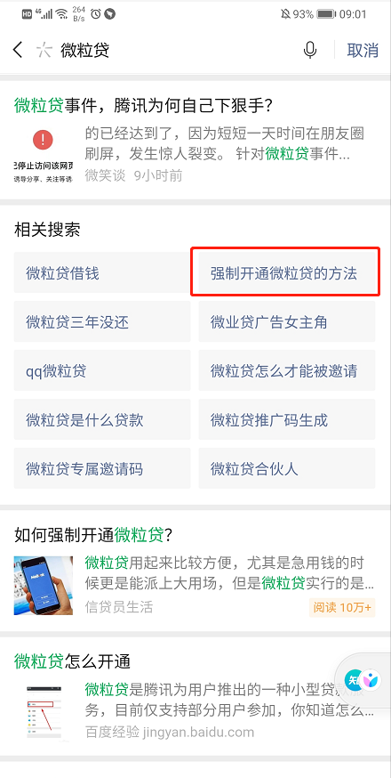 在搜一搜里搜索“微粒贷”时出现:“强制开通微粒贷的方法”的内容,实际上点进去出现的内容并无真实凭据,纯属恶意诋毁和蹭热度,望处理。