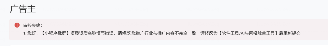 申请成为小程序广告主,审核失败: