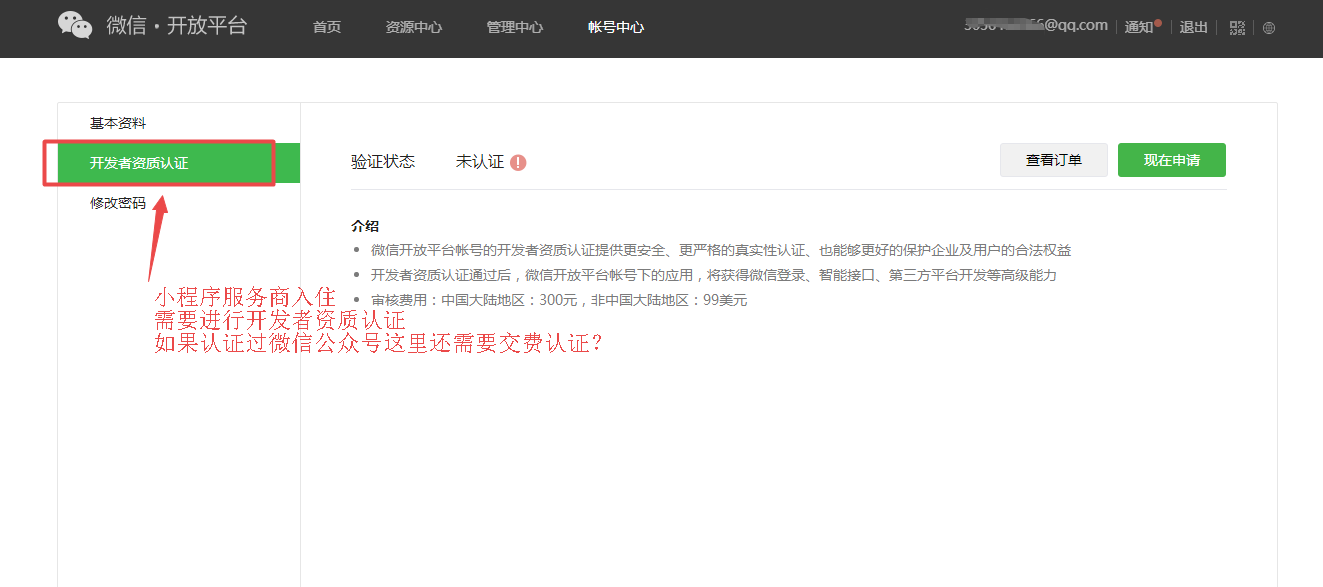 1.申请小程序服务商,需要花三百元认证开发者资质,如果有已认证的公众号,这里还需要花钱认证吗?