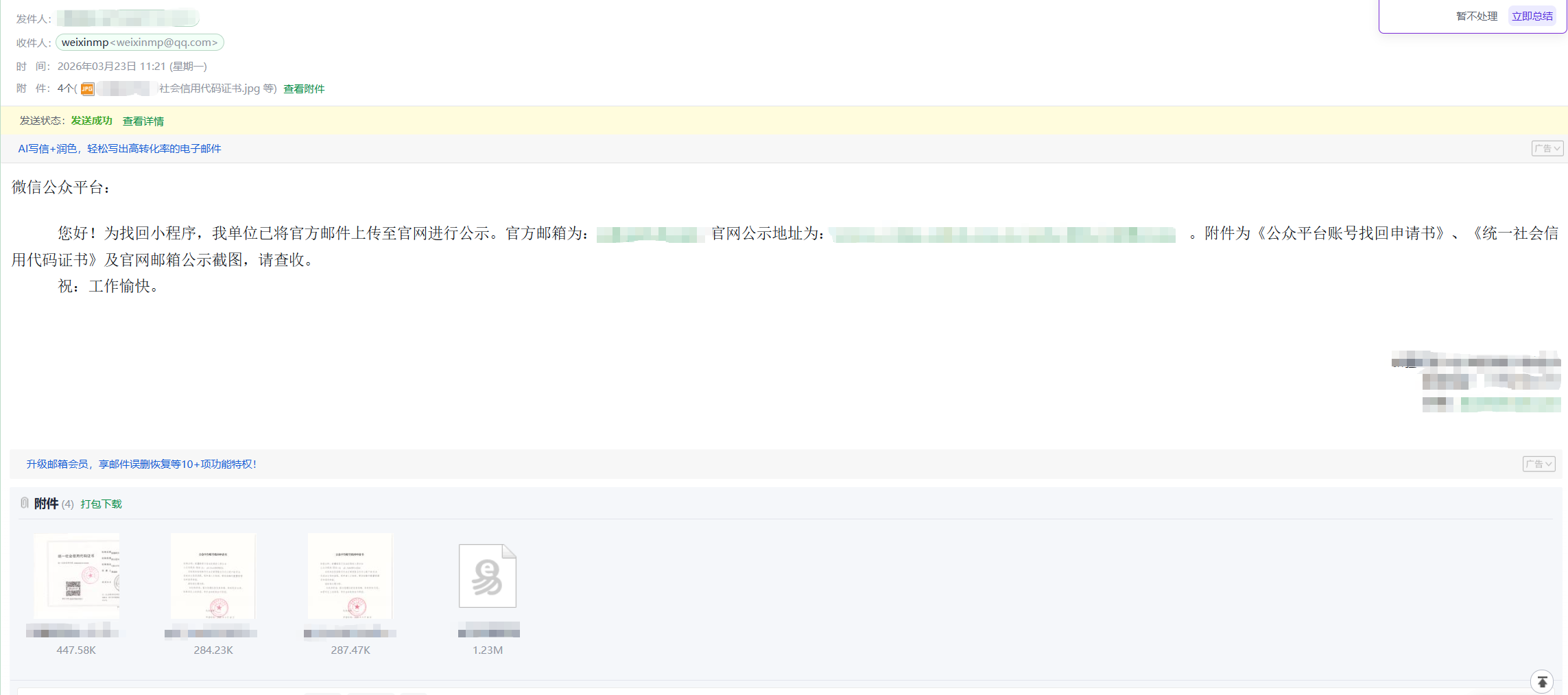 3月23日11:21已将邮件发送给weixinmp的邮箱,请问找回为什么一直没有进展,如有缺失资料,请联系我提供,谢谢。