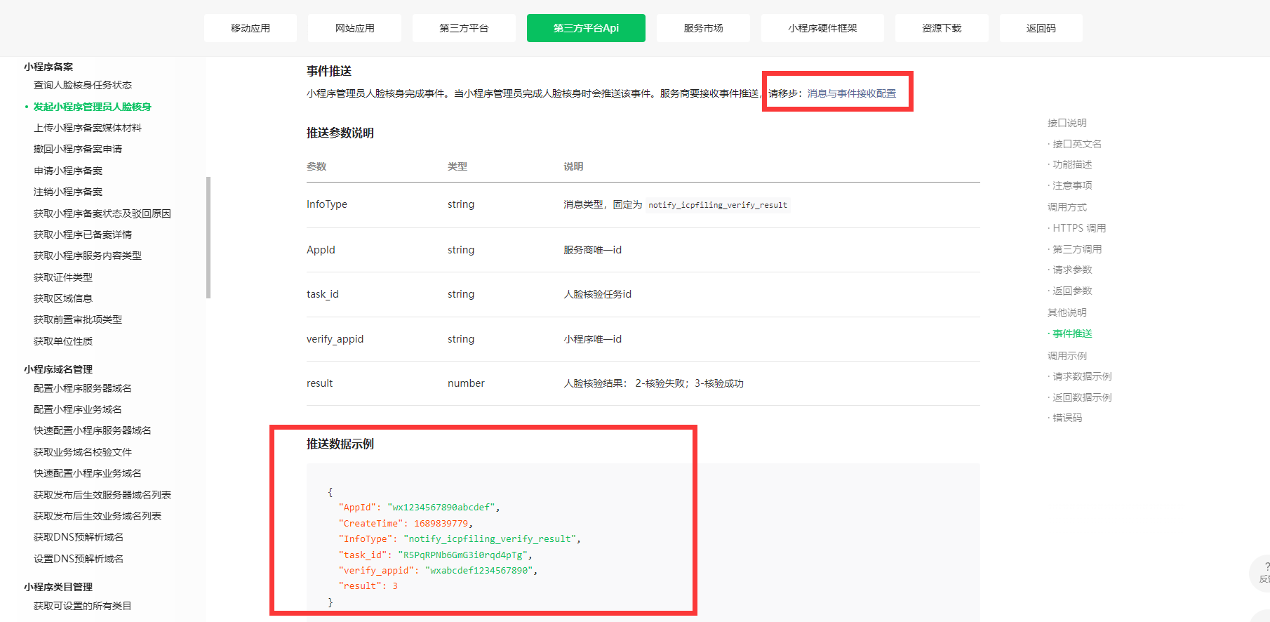 服务端作为第三方,代小程序备案时,人脸核验回调,备案申请接口的回调,接口描述回调内容体为JSON。