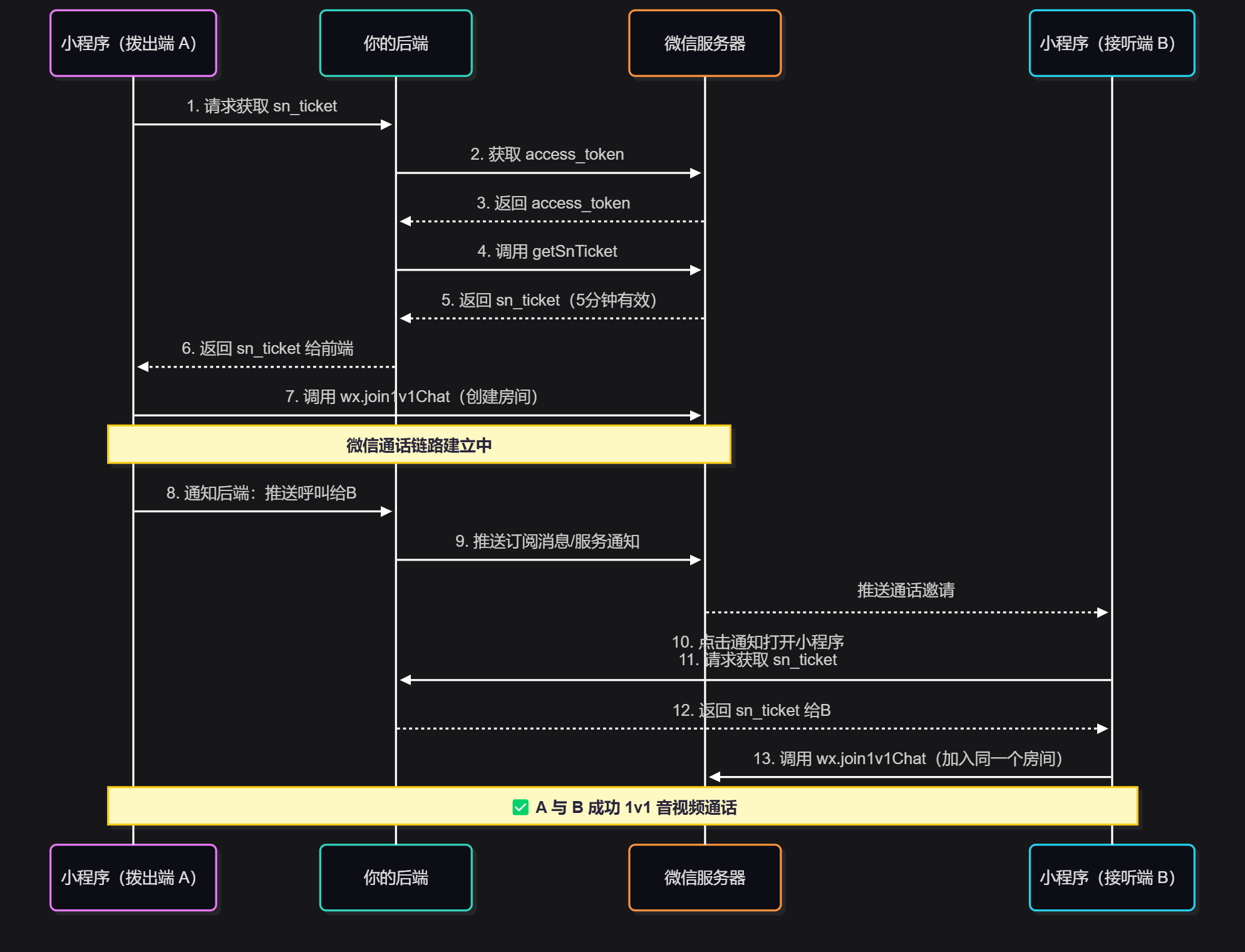 VOIP 实时语言、视频 通话,首先双方必须要在同一个小程序内,如果不同小程序,则建议A、B都跳转到 C 小程序上进行通话