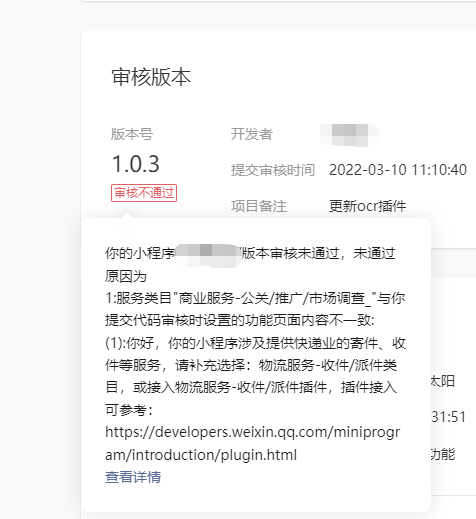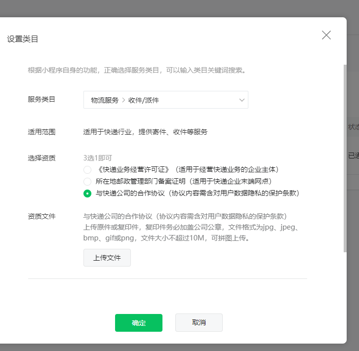 问题:小程序第一次审核发布,提示服务类目不符合,目前小程序只有一个商业服务类目,添加服务类目,选择收派件,需要上传资质,目前没有这些资质,怎么通过审核。或者怎么接入收派件插件,需要再开发个小程序插件吗,对这一块不太了解,请大佬指教