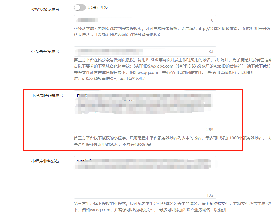 开放平台后台,已经填上 小程序服务器域名了。怎么一键授权后,还是只有一个 授权发起域名 在小程序服务器域名内。怎么让其它域名也自动一并添加上呢?