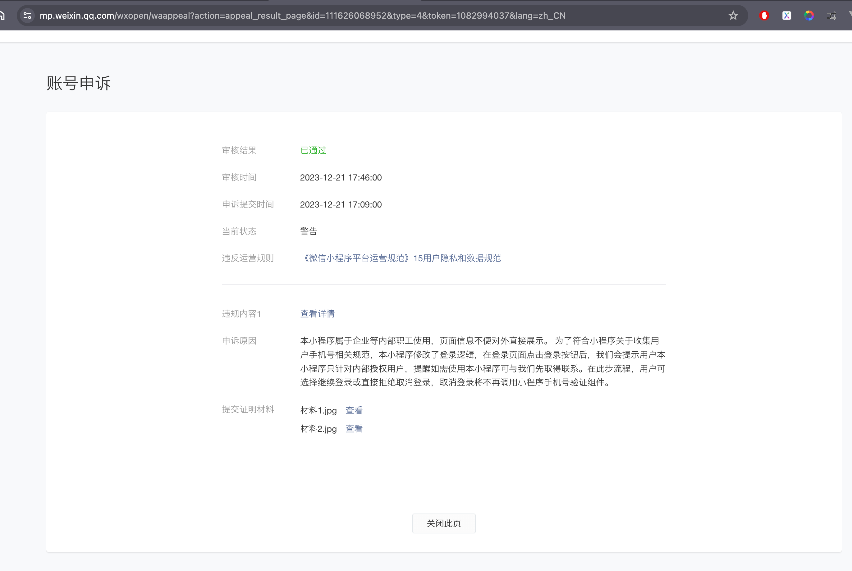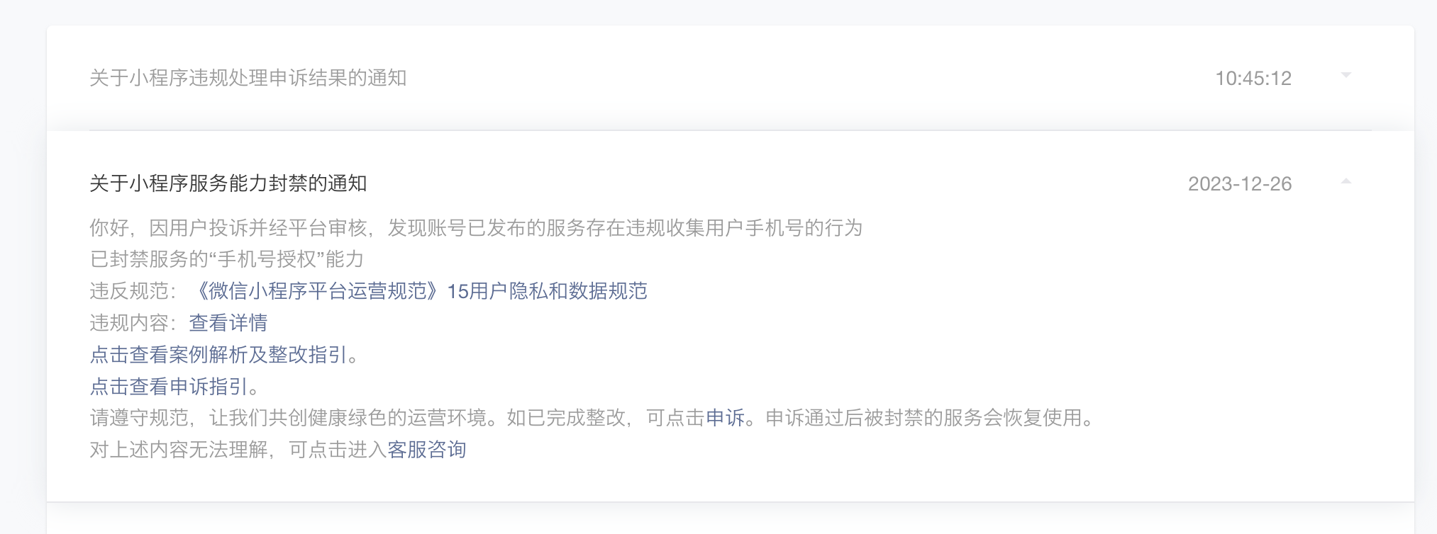 你好,经核实,你申诉的是警告站内信,需通过小程序相对应的功能封禁站内信进行申诉才可恢复对应的封禁功能;若小程序已整改完毕,请通过小程序功能封禁站内信进行申诉。