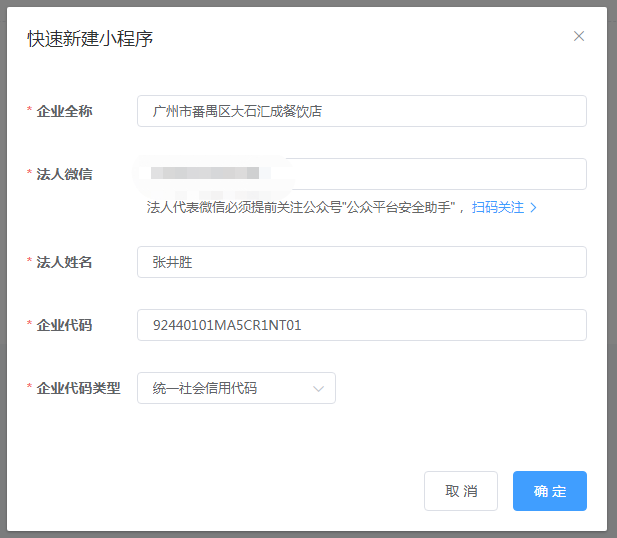 营业执照资料反复对过是没错的,我输入企业名称为空就可以发送成功(由此知道微信的资料库不同步),但是企业名称为空众所周知会触发“快速创建小程序接口”的主体创建数量已满BUG,麻烦工作人员看一下这个企业的资料,帮我同步一下。
