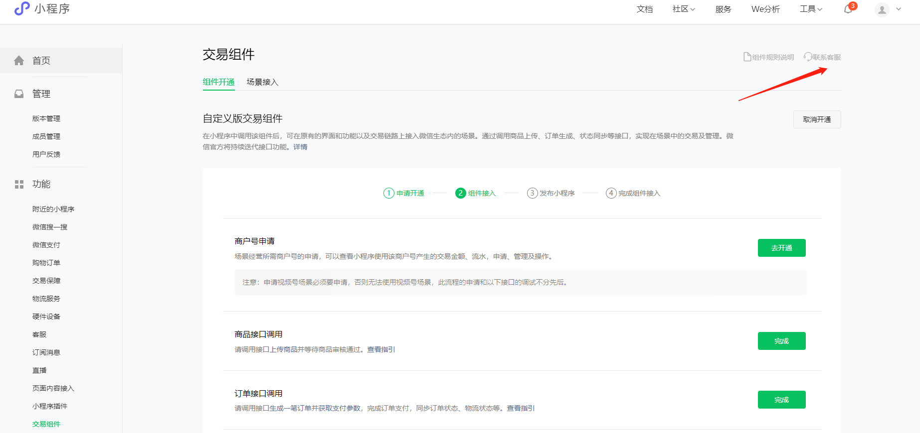 路径:https://mp.weixin.qq.com/-小程序管理后台-交易组件-联系客服