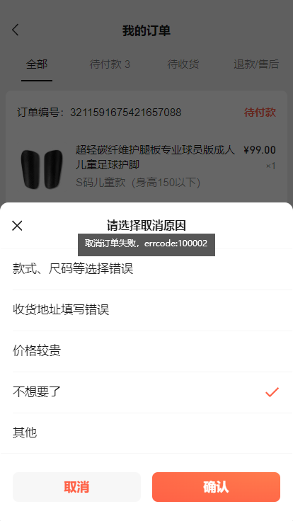 2、订单列表取消订单时,提示,取消订单失败:100002