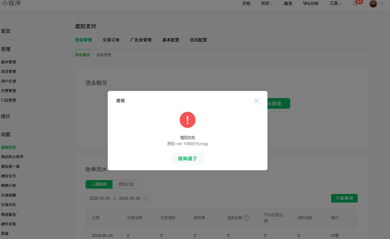 我这里有5个微信小程序虚拟支付账户提现都出现了这个提现失败(原因: ret: 1000019,msg:)提示,可以帮忙看下是什么原因吗。别的小程序都可以正常提现,只有这5个号多次重试也是出现这个提示。