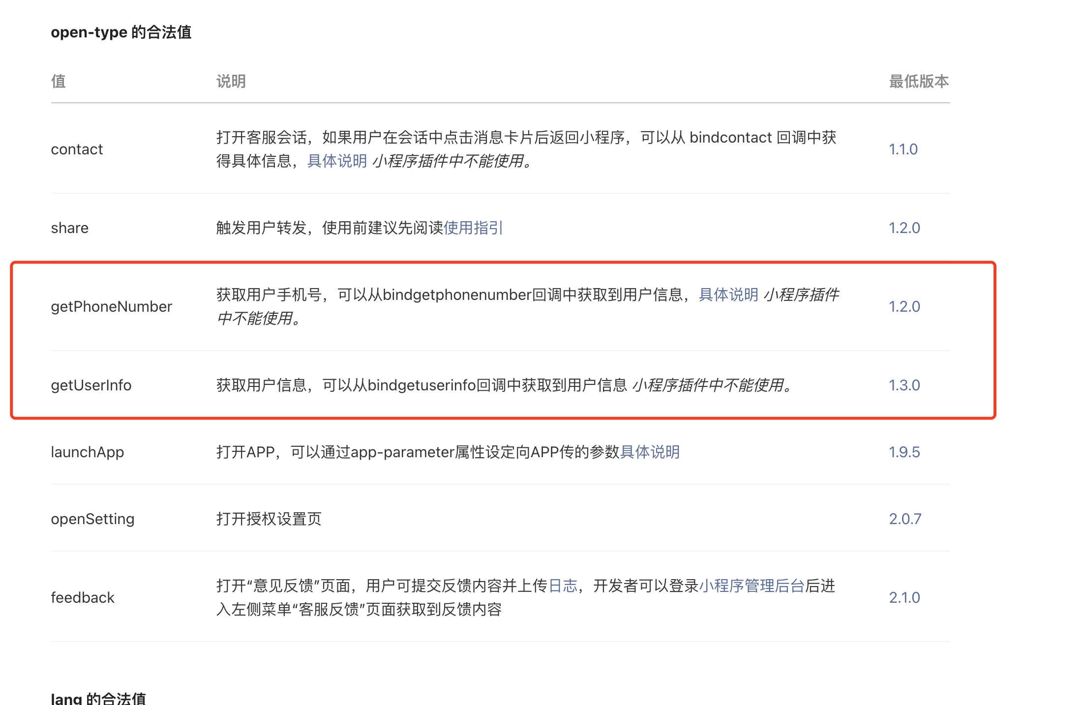 bindgetuserinfo 用户点击该按钮时,会返回获取到的用户信息,回调的detail数据与wx.getUserInfo返回的一致,open-type="getUserInfo"时有效 bindgetphonenumber 获取用户手机号回调,open-type=getPhoneNumber时有效
