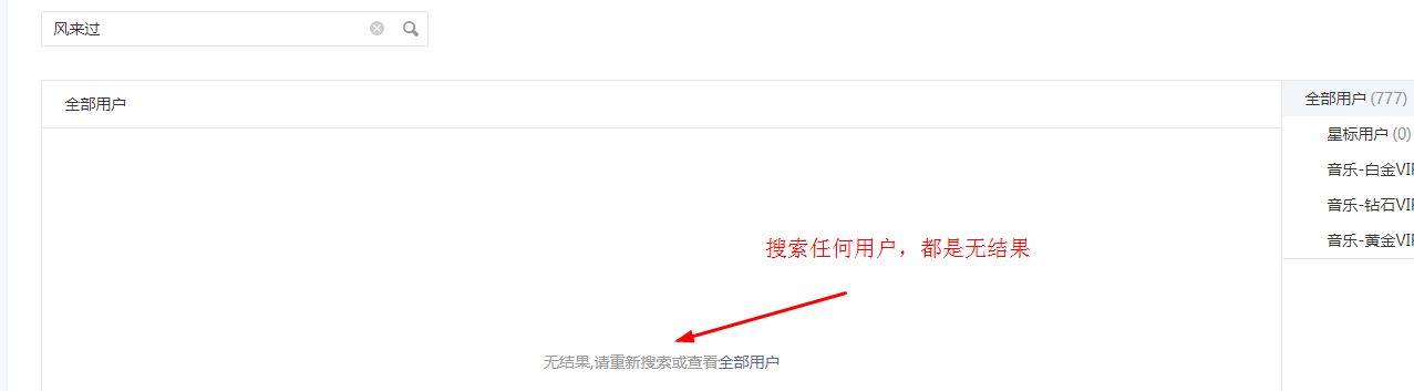 我也遇到同样的问题,这明显是存在BUG,消息管理模块可以正常搜索消息和昵称,但是用户管理模块搜索功能存在BUG(不管搜索什么都是无结果)。