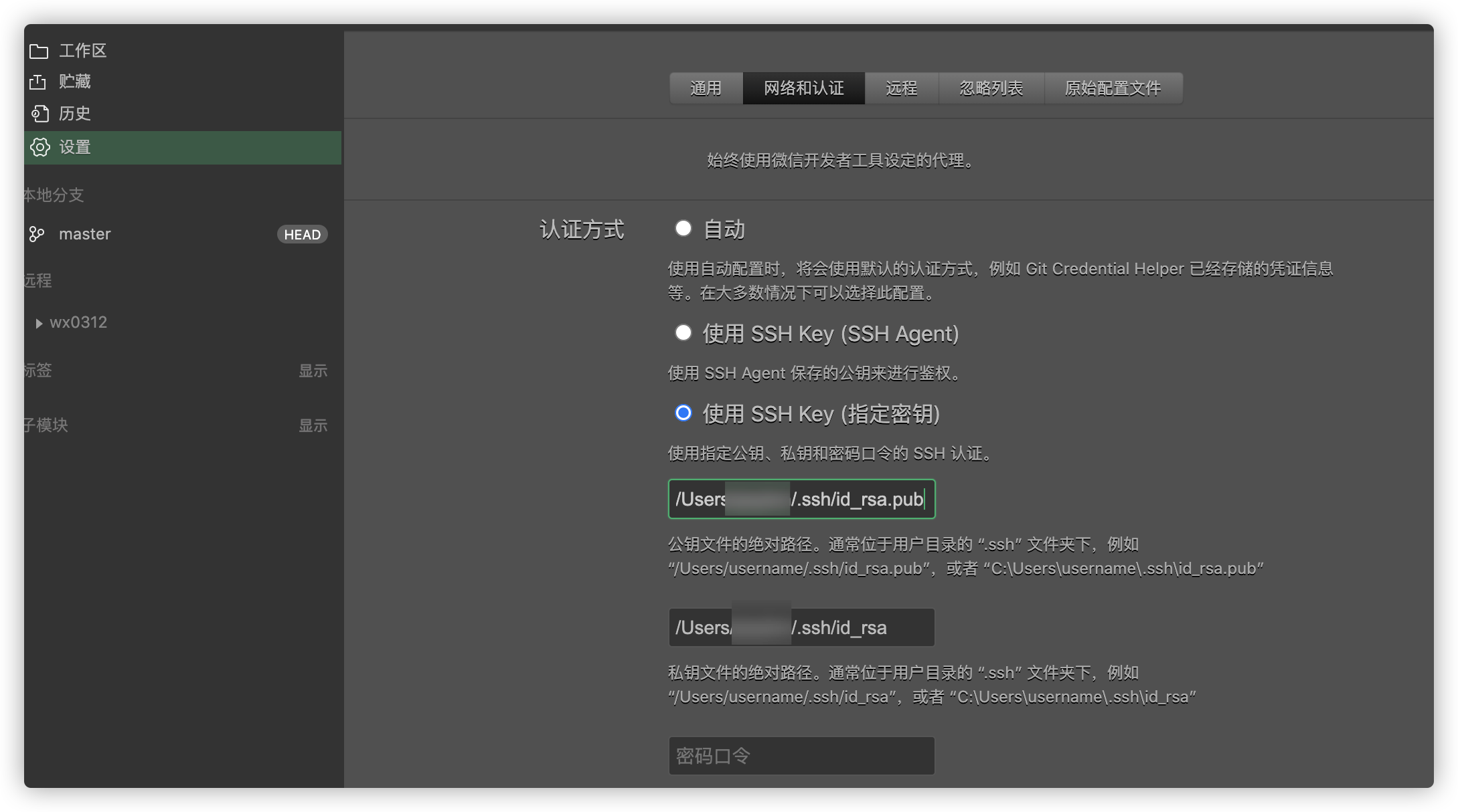 1, 是否正确填写了密码口令,并且在 SSH密钥 - Profile Settings - 微信开发者代码管理 (qq.com) 正确设置了这个 SSH Key 呢?