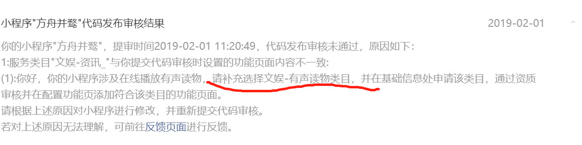 你好,经核实,贵方小程序最新提审版本:1.涉及在线阅读小说/电子书,需补充选择文娱-小说类目;2.涉及在线播放有声读物,还需补充选择文娱-有声读物类目(详图如下)